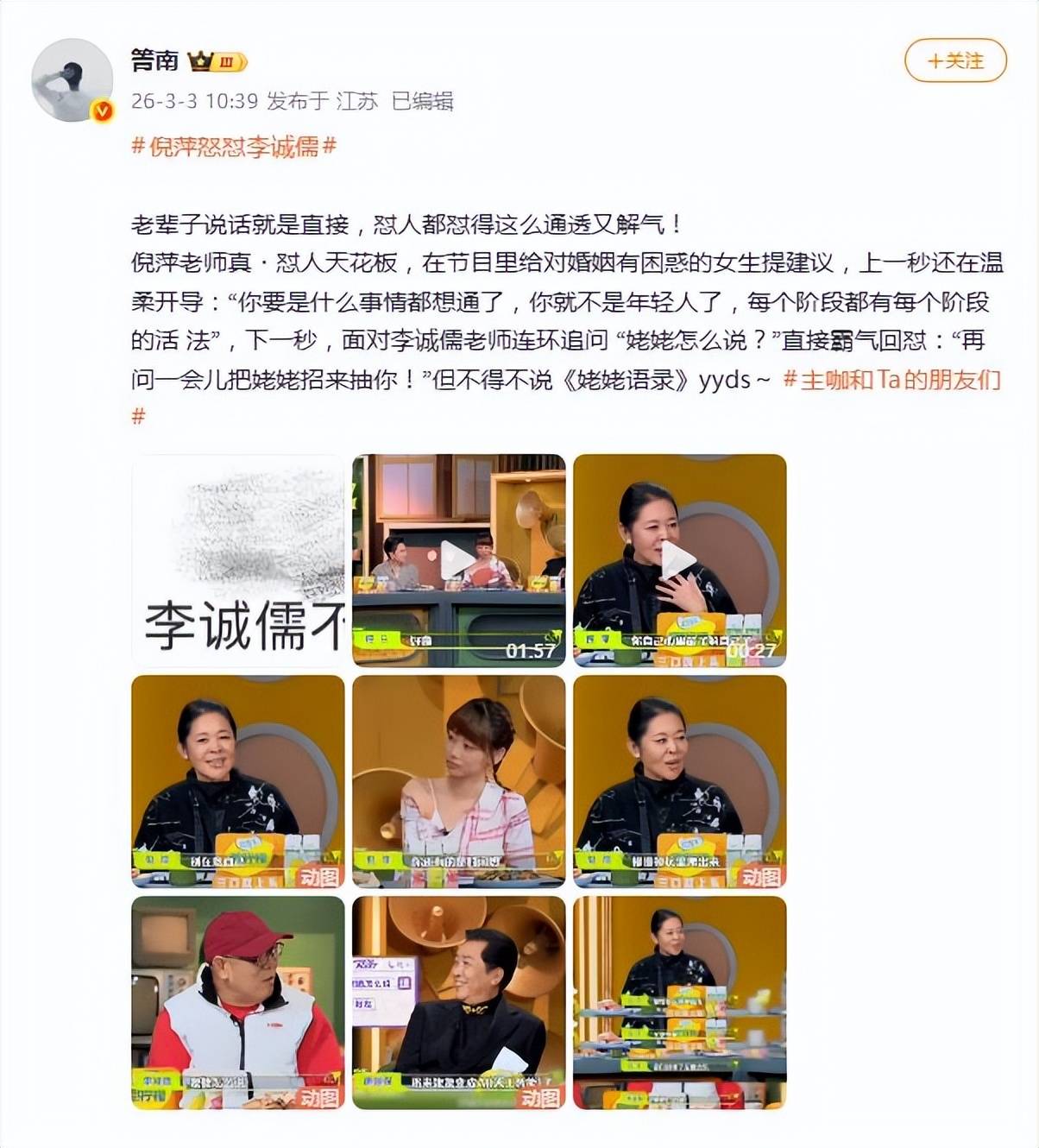 倪萍的“阶段活法论”引发了大量年轻人的共鸣。许多网友感慨,“看倪萍说话能让人静心思考生活”,认为她的开导提供了宝贵的包容感。在充满不确定性的时代,这种“选工作或婚姻本无标准答案,享受当下更重要”的观点,无疑是一种减压和慰藉。而她犀利又不失风趣的回应风格,与李诚儒的执着追问形成的鲜明对比,成了节目最大的看点之一。